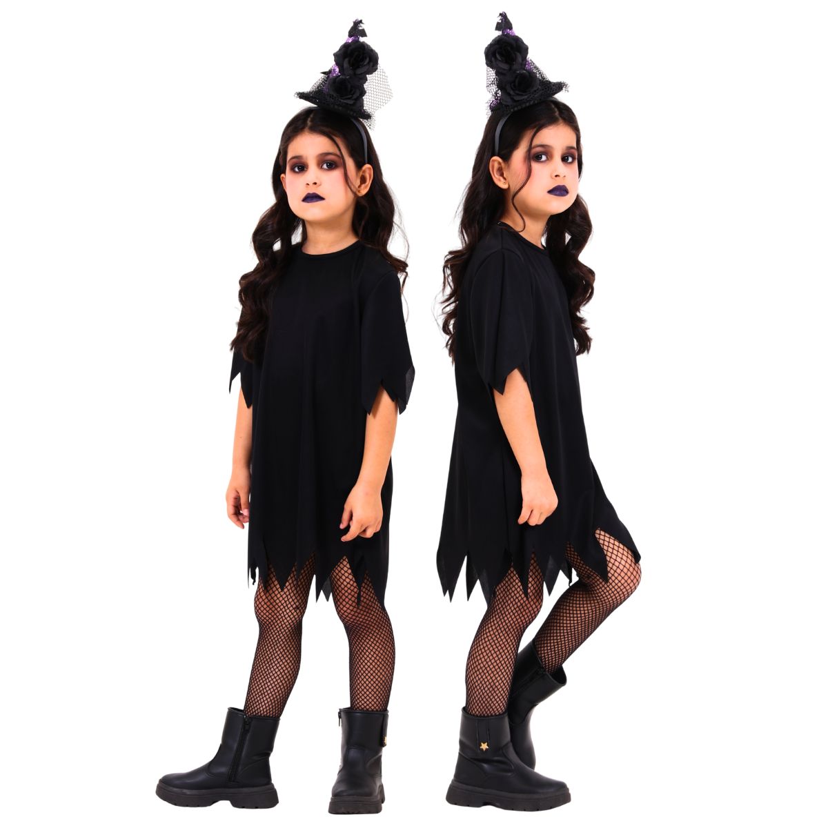 Com modelagem soltinha e barras recortadas em pontas, essa fantasia traz o toque mágico e misterioso perfeito para a data mais divertida do ano. O tecido leve garante conforto durante as brincadeiras, enquanto o visual totalmente preto combina com chapéus, tiaras, botas e acessórios assustadoramente fofos!