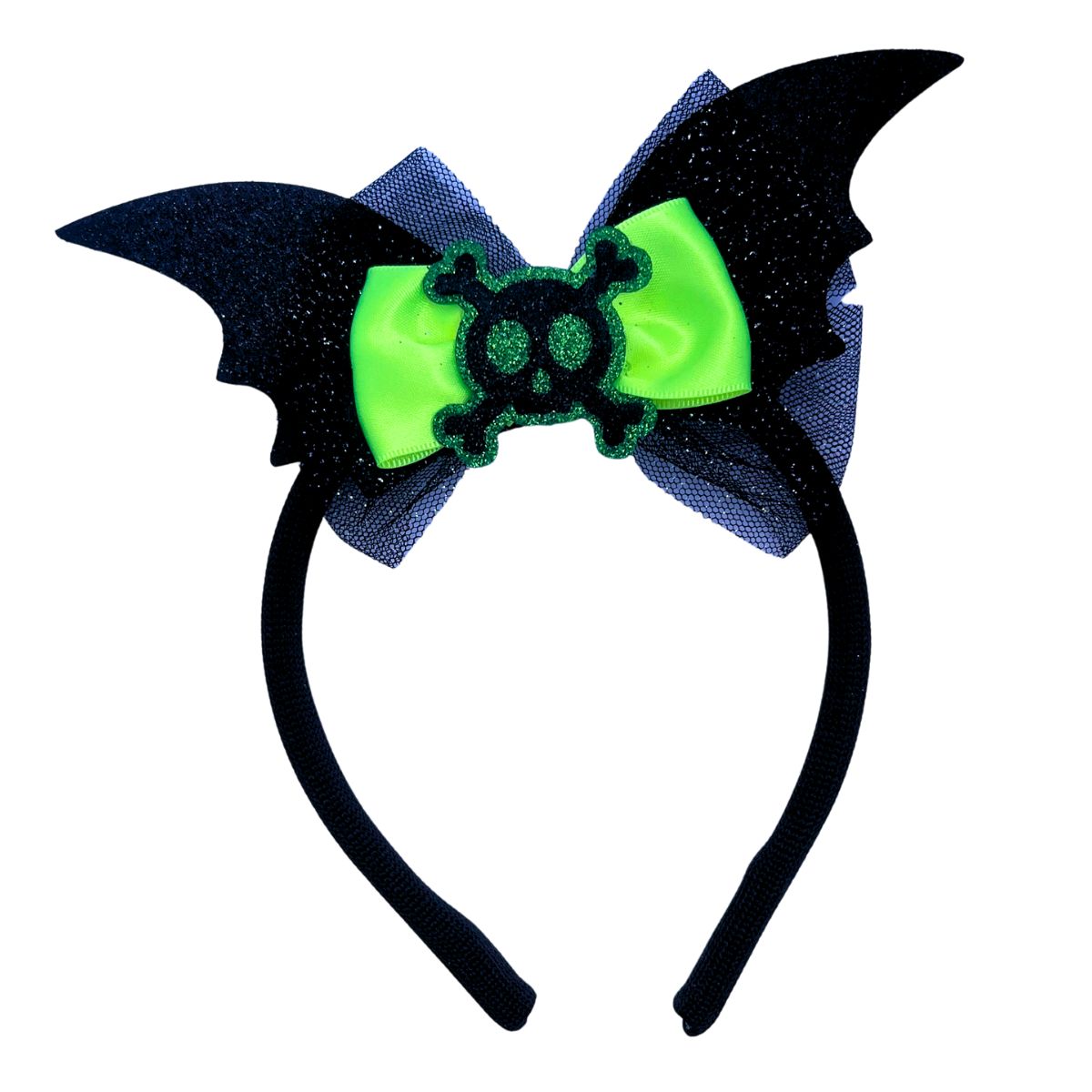 Tiara de plástico de morcego com detalhe verde limão e aplique em EVA